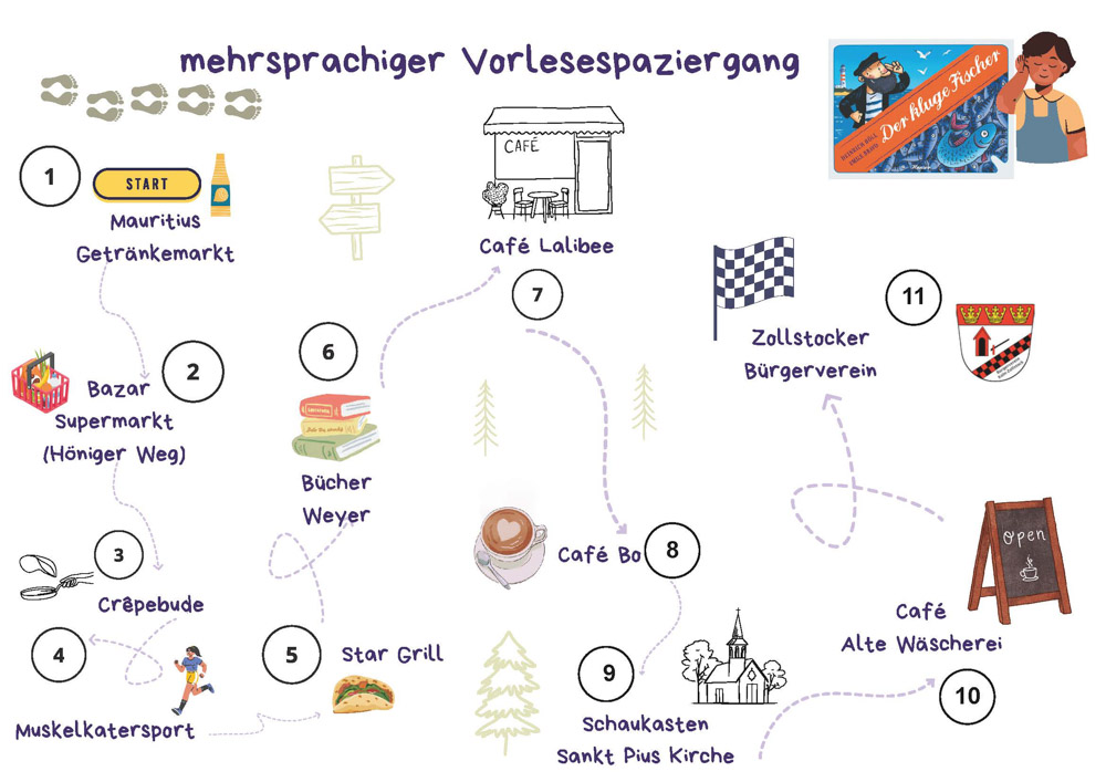Vom 29. September bis zum 10. Oktober sind in Köln-Zollstock insgesamt 11 Plakate verteilt, auf denen Sie sich per QR-Code Heinrich Bölls Bilderbuch “Der kluge Fischer” anhören können – und das in vielen verschiedenen Sprachen! Gemeinsam mit Ihren Kindern können Sie mithilfe der Landkarte von Station zu Station spazieren und dabei in die Geschichte eintauchen. Eine tolle Gelegenheit, Sprache, Literatur und den Stadtteil auf ganz neue Weise zu erleben. Viel Spaß beim Zuhören, Entdecken und Spazierengehen!