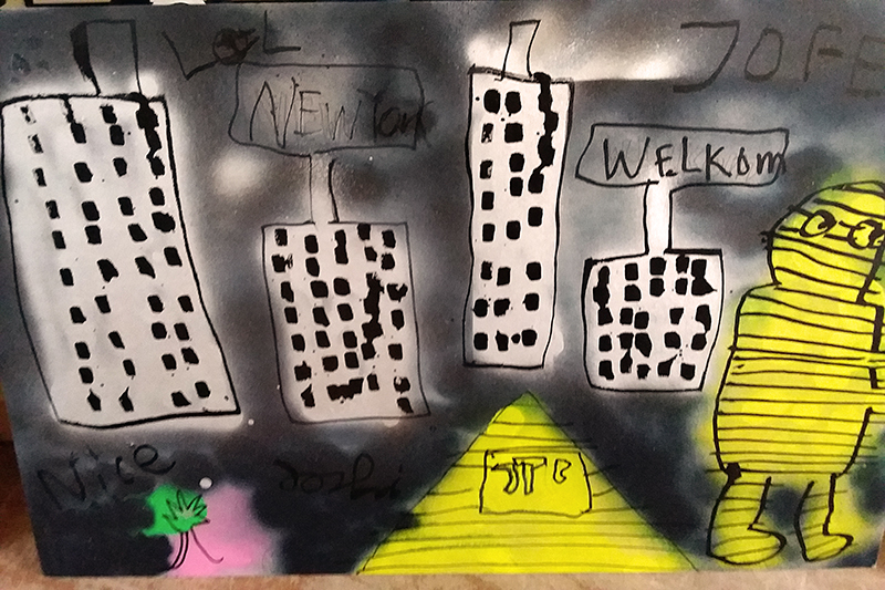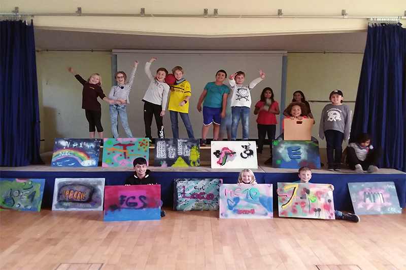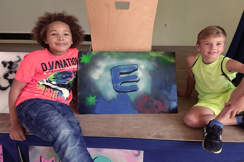 Silvia Horsch und die Kinder der Eulengruppe haben sich in den Wochen vor den Herbstferien mit dem Thema Graffiti beschäftigt.