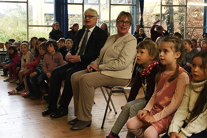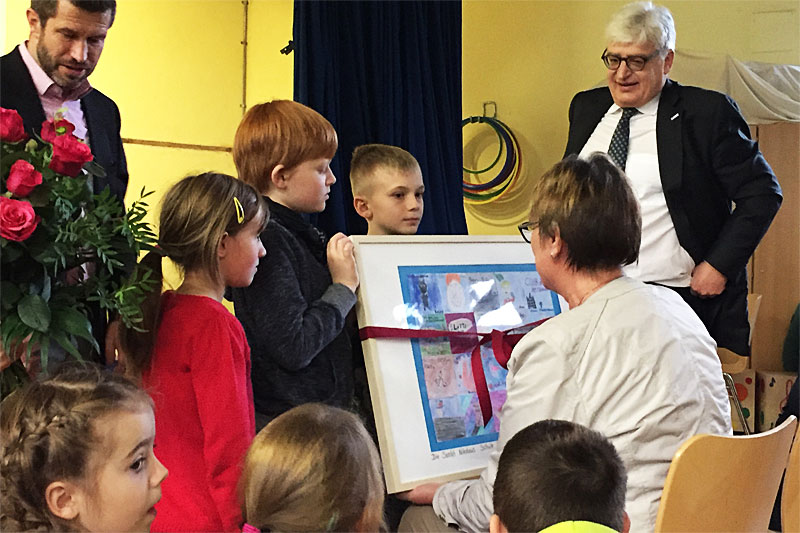 In dieser aufregenden Zeit unterstützte uns besonders eine Dame mit viel Engagement und Herzblut, kümmerte sich um die Abwicklung unserer zahlreichen Bestellungen, hakte nach und gab wichtige Hilfestellungen: Frau Gorniak . Sie geht nun wohlverdient in den Ruhestand über. Am Montag verabschiedeten sie Kinder einiger Klassen im Rahmen einer kleinen Veranstaltung.