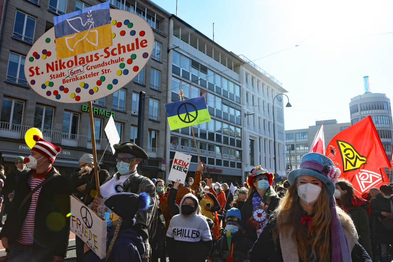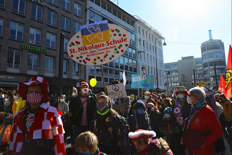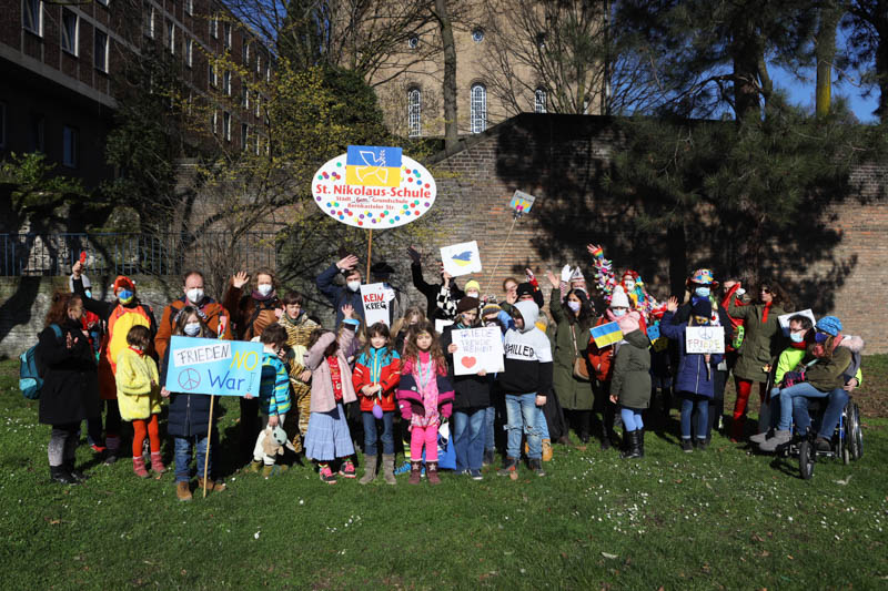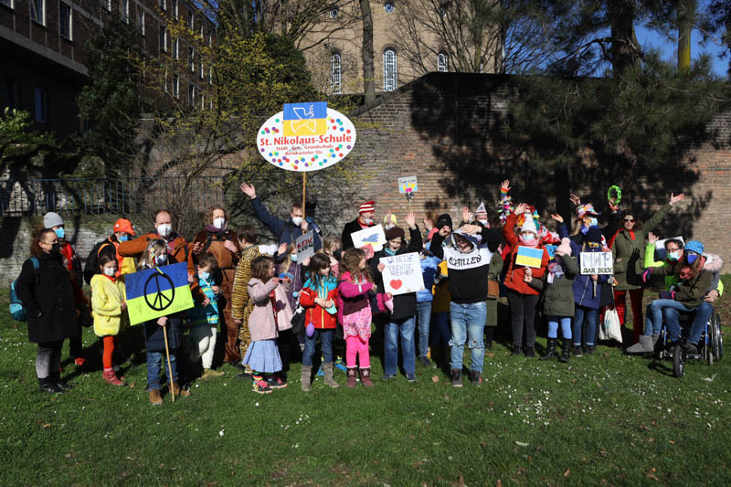 Nach einem Aufruf der Schulpflegschaft und der Schulleitung nahmen viele Schüler*innen, Eltern und Lehrer*innen der Sankt Nikolaus Schule an der Friedensdemonstration am Rosenmontag teil.